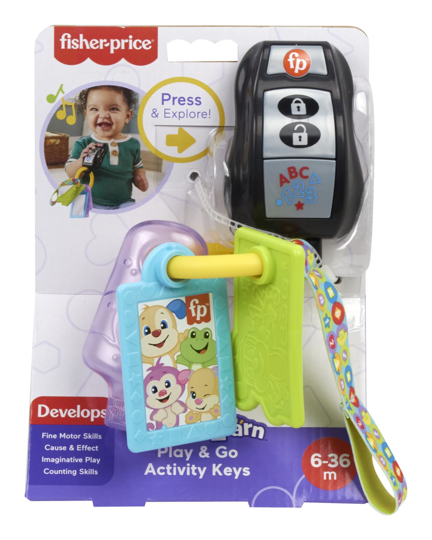 Get ready for on-the-go learning adventures with the Fisher-Price Laugh & Learn Play & Go Activity Keys! Designed for little hands, this travel-themed activity set features four engaging toys attached to a soft fabric lanyard, helping babies and toddlers explore fine motor skills, cause & effect, counting, and sensory play.