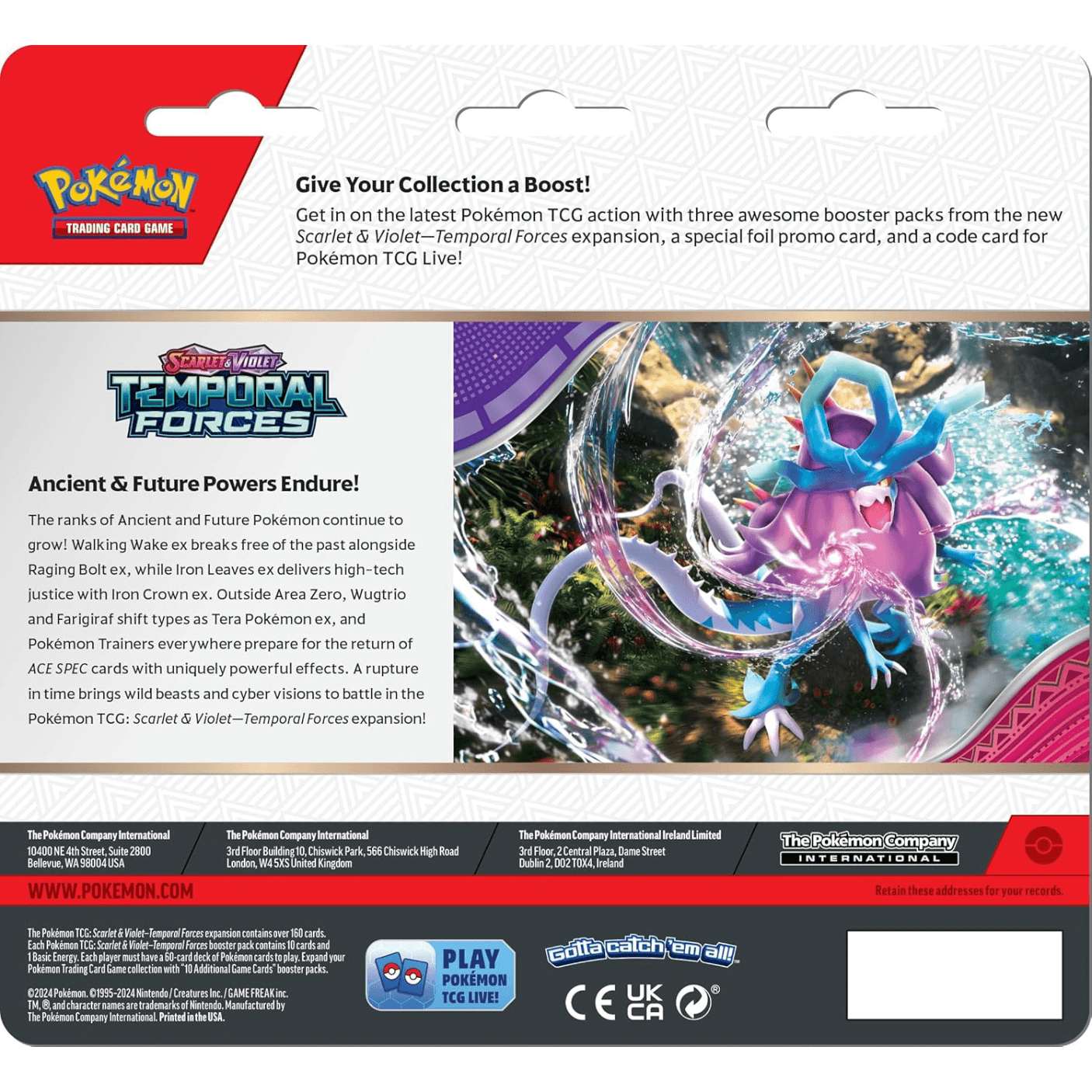 Harness the Power of Time! The ranks of Ancient and Future Pokémon continue to grow in the Temporal Forces expansion! Walking Wake ex and Raging Bolt ex break free from the past, while Iron Leaves ex and Iron Crown ex bring high-tech justice from the future. Meanwhile, Wugtrio and Farigiraf shift types as Tera Pokémon ex, and ACE SPEC cards return with game-changing effects!