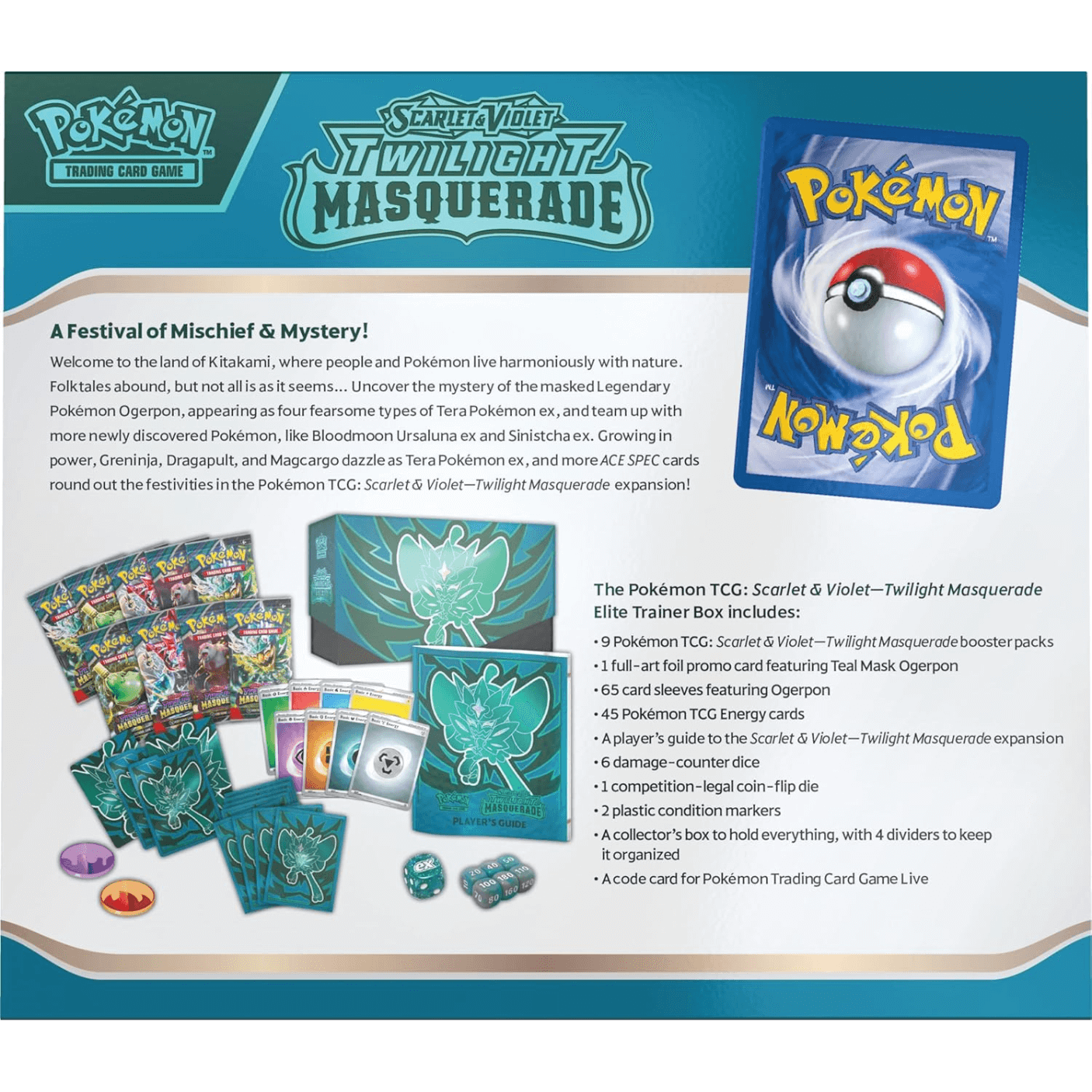 Step into the mysterious land of Kitakami, where new Pokémon emerge and ACE SPEC cards shake up the game! The Twilight Masquerade Elite Trainer Box is your gateway to powerful new strategies, featuring 9 booster packs, a stunning Teal Mask Ogerpon promo card, and all the essentials for competitive play.