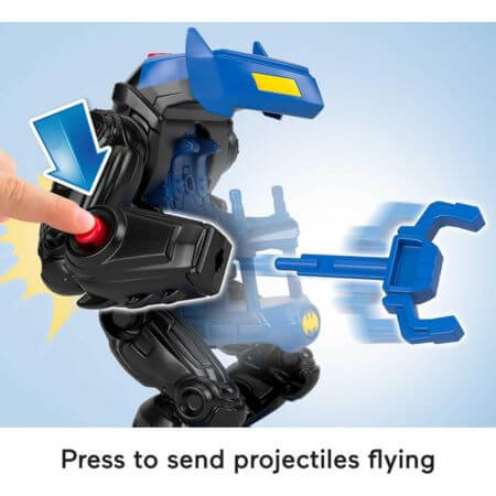Young superheroes can power up their Batman adventures with the Imaginext® DC Super Friends™ Light-Up Batman Mech Suit! Place the Batman figure inside the mech suit and press the top button to activate a cool light-up feature in his clear torso. Equipped with a projectile launcher and chopping arm action, this mech suit is ready for action-packed battles against Gotham’s villains. Perfect for preschool crimefighters, this set encourages imaginative storytelling and hands-on play.